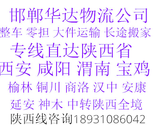 ★ 本站所l列邯鄲到咸陽貨運(yùn)專線費(fèi)用與時效僅供參考,如需詳細(xì)了解最低資費(fèi)請電話咨詢。